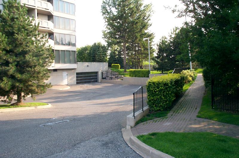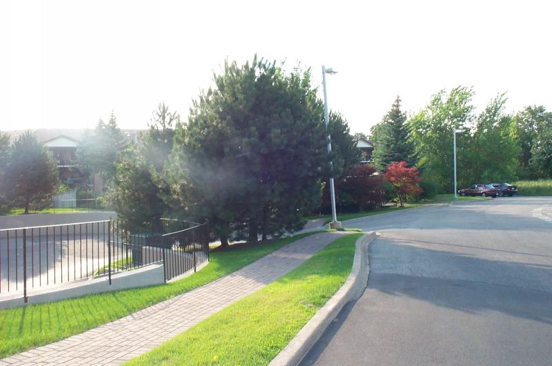 Path from front entrance towards pool and garage